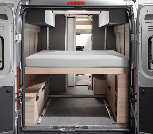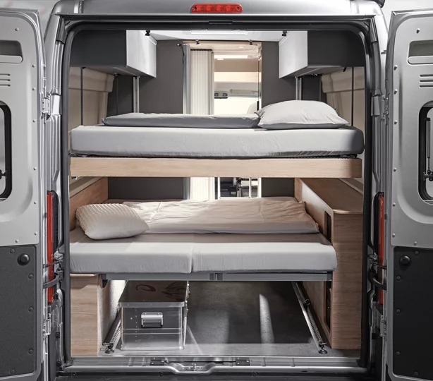 Pensato per una coppia che desidera comfort e grande capacità di stivaggio, il Globetrail 640 HR può comunque offrire quattro posti letto grazie all’opzione di un secondo matrimoniale sotto al basculante, oppure un letto singolo ricavabile dalla dinette, ma volendo anche aggiungere un tetto a soffietto con un altro letto al suo interno. Inoltre, il letto basculante regolabile in altezza consente di modulare lo spazio del garage offrendo un ottima possibilità di stivaggio.