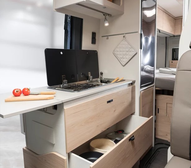 La cucina dispone di un fornello a due fuochi e lavello in acciaio inox integrato, con coperchio in cristallo, ampi cassetti servosoft, per alimenti e stoviglie, pensile e barra portatutto vicino al frigorifero da 84 litri.