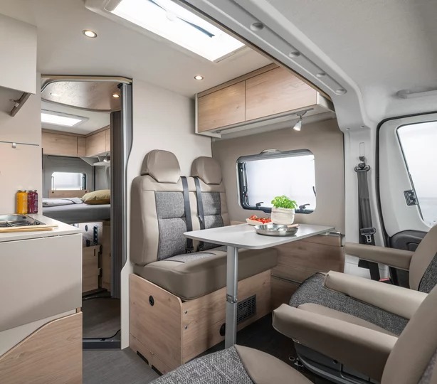 All’interno sono disponibili due stili d’arredo con due diverse colorazioni: noce e bianco. La zona living, presenta un divano fronte marcia per due persone, tavolo a parete, allungabile in opzione, che può accogliere anche quattro commensali grazie ai sedili giravoli in cabina guida. Al di sotto del tavolo trova spazio una comoda botola utile per riporre le scarpe o altro. Esternamente è personalizzabile con varie colorazioni e dotazioni del Pack Comfort, che comprende tre pack specifici, una batteria servizi da 95 Ah, riscaldamento Truma Combi Diesel da 6 kW, illuminazione LED orientabile e una garanzia anti-infiltrazioni di ben sei anni. Dethleffs Globetrail 640HR: Comfort e versatilità in movimento!