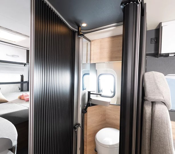 Il Dethleffs Globetrail 640 HR amplia l’offerta dei furgonati, lungo 636 cm. si distingue per una disposizione interna inedita con matrimoniale longitudinale basculante con un ampio vano di carico sottostante, toilette nella parte centrale con doccia ricavata nel corridoio, di fronte frigo e blocco cucina, con semidinette per quattro persone nella parte anteriore.