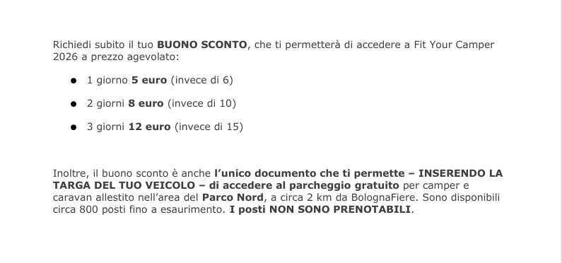 26/02/2026 - Un buono sconto per Fit Your Camper dal 9 al 12 aprile 2026 a BolognaFiere.