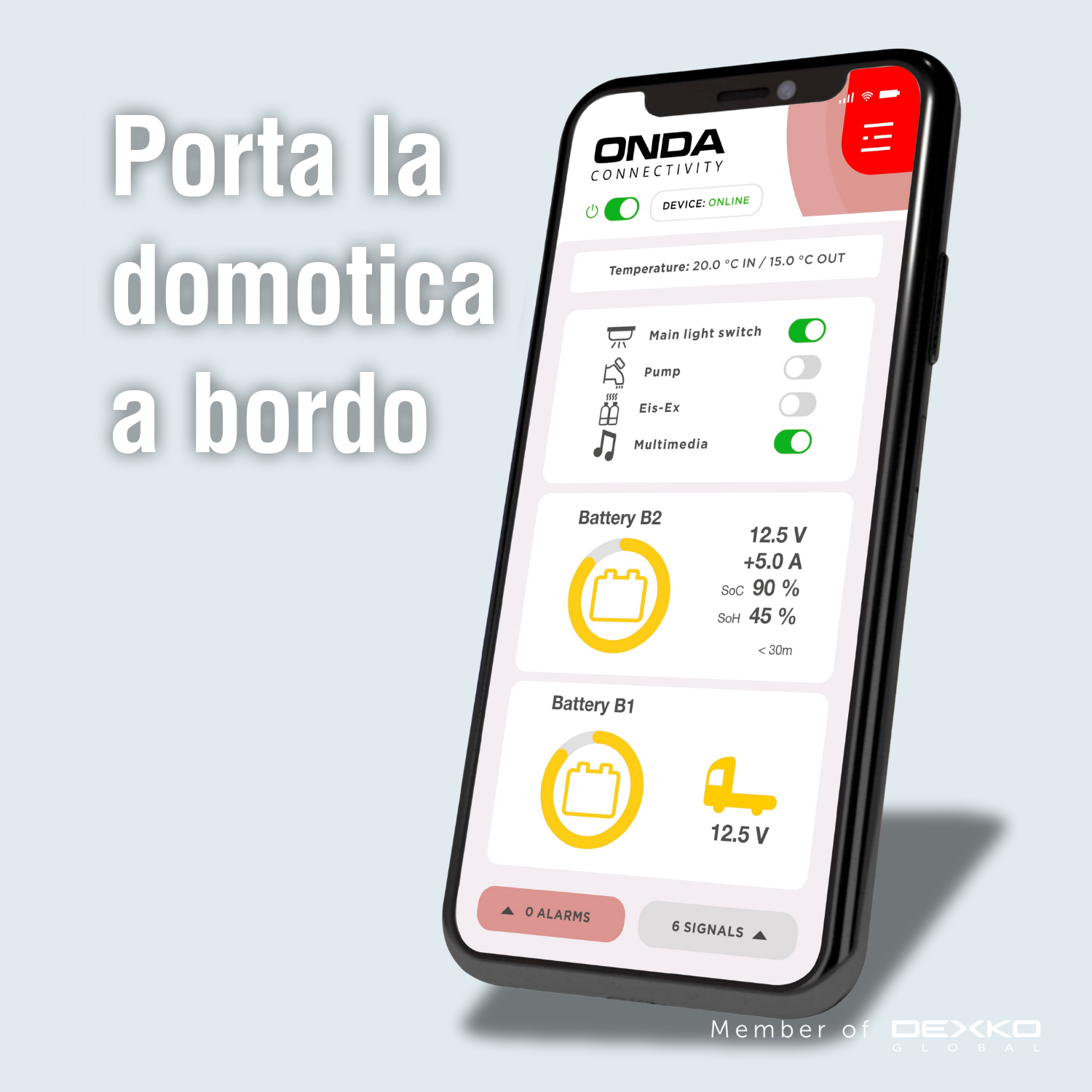 Il cuore della piattaforma ONDA Connectivity è un’infrastruttura smart che consente la gestione e il monitoraggio delle principali funzioni di bordo da un pannello di controllo o da smartphone. Questo permette di avere informazioni complete su numerose funzioni del veicolo e un pratico controllo delle utenze: